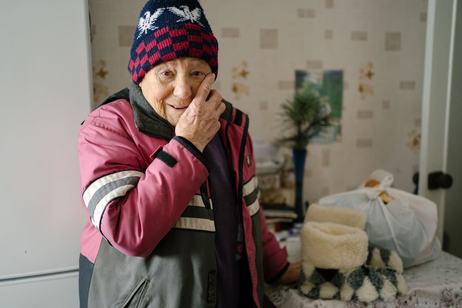 At Popova's door, on top of the usual food package, two Starenki volunteers were delivering additional publicly-funded "warmth" aid consisting of sheepskin house slippers and a warm blanket. Simple necessities, that in current conditions can be life-saving.